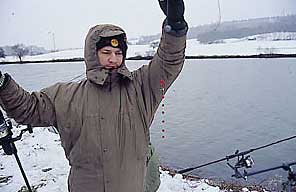 Weil ich für die Futterkampagne und auch beim Angeln als Köder sehr kleine Boilies benutzte, passe ich auch meine Montage dem an. Seit Jahren benutze ich nur die Safety-Bolt-Montage und nie kleiner als 150 g. In der restlichen Jahreszeit benutze ich Kombi Rig mit 20 cm 25 lbs Amnesia und 2 cm 35 lbs Krystonite und jetzt in der Winterzeit 25 cm 20 lbs Amnesia und 5 cm 25 lbs Krystonite. Die meistbenutzte Hakengröße ist die Größe 6, beködert mit 1-2 Minis oder einem 14 mm Boilie und natürlich mit PVA-Stringer oder PVA-Beutel dazu. Die Ruten, die ich konstant am Neckar benutze für die mittlere Distanz sind 12` 2 lbs mit parabolischer Aktion, die mir ein fantastisches Gefühl beim Drillen großer Karpfen verleiht. Schlagschnur benutze ich nie, deswegen habe ich auf der Rolle durchgehend 0,40 mm monofile Schnur. Neben Futter und Ködern ist noch einer und vielleicht der wichtigste Faktor für einen guten Fang am Neckar der Wasserstand. Ich möchte nicht daran denken wieviel Futter ich sonst in den Neckar reingekippt habe ohne angeln zu können, weil der „Bach“ mir einen Strich durch die Rechnung gemacht hat. Zur Zeit reicht ein eintägiger Dauerregen aus es unmöglich zu machen am Neckar zu angeln. Konstanter Wasserstand mit winzigen Erhöhungen ist sehr gut für einen guten Fang. Mit leicht erhöhtem Wasserstand sind die Karpfen mehr in Bewegung und automatisch haben sie einen höheren Nahrungsbedarf. In der Winterzeit sind außer dem Wasser-bestand auch noch die Wetterbedingungen entscheidende Faktoren für den Erfolg. Mäßige Niederschläge und Wärmeausbrüche haben sehr positive Wirkung auf den Appetit des Karpfens. Nur im Fall einer Krankheit oder Abwesenheit könnte es passieren, daß ich nach 3 –4 Nächten mit einer Temperatur von + 4° C nicht am Wasser bin. Es geht nicht darum, daß es mir angenehm ist nur bei Plus-graden zu angeln, ich habe auch schon bei –15° C die ganze Nacht am Wasser verbracht, sondern es geht darum, daß nach 3 – 4 Nächten mit + - Graden die Wassertemperatur sich um mindestens 2 Grad erhöht, was sehr vielver-sprechend klingt.