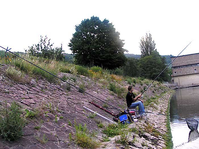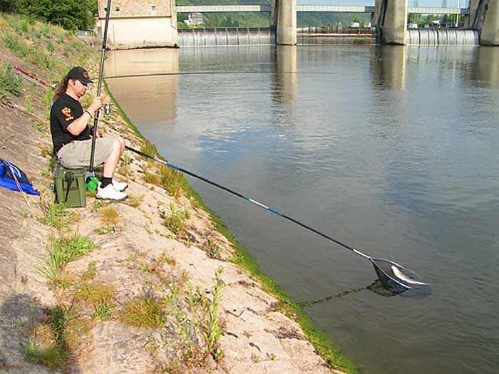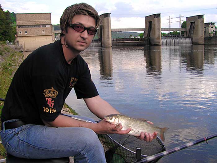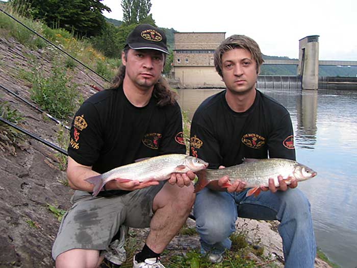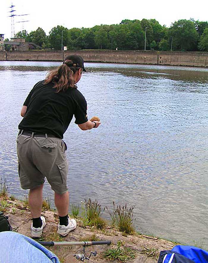 Noch bevor wir an das Wasser kamen wussten wir schon, dass die Strömung an der Stelle, die wir ausgesucht haben ziemlich "hart" war. Wir wollten direkt unter einer Schleuse fischen, wo das Wasser recht schnell floss. Obwohl Tomi die Stelle kannte haben wir loten müssen, um eine Rinne oder eine Unebenheit zu finden an der sich die Nasen überwiegend aufhalten. Nach längerem Loten fanden wir endlich das was wir suchten. Ich hatte noch meine 11 m. Steckrute dabei und entschloss mich in einer Entfernung von ca. 10 m. von dem Ufer zu fischen, wo das Wasser etwas langsamer floss und Tomi fischte in einer Rinne, die gerade ca. 5 m. von dem Ufer weg war mit natürlich deutlich stärkerer Strömung wie bei mir. Dann sind zwei Entscheidungen gefallen was die Futterkampagne betrifft, nämlich Tomi wollte grössere Kugeln füttern, die auch etwas fester gedrückt waren, in deren Mitte er noch ein Stein reindrückte um an Gewicht zu bekommen. Er fütterte eine Stelle punktgenau um die Fische auf einem kleinen Raum zu behalten. Ich machte kleine Kugeln, Steine ließ ich weg, fütterte fluss-aufwärts und habe versucht eine längere Spur anzulegen, so dass ich meine Montage über längere Stecke treiben lassen kann, um mir die Chance auf einen Biss zu erhöhen.