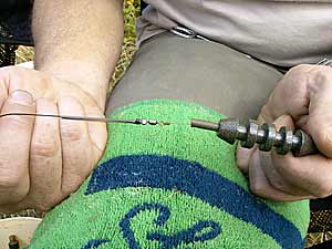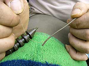Nach dem Vorfach an den Wirbel binden, wird ums obere Ohr des Wirbels die Hauptschnur gebunden... |