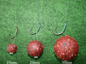 Big Ball Boilies von 30mm sind die richtigen "Murmeln" für Situationen, bei denen man sich an Gewässern mit vielen kleinen Karpfen oder hohem Weissfischvor-kommen zu den "Großen" durchkämpfen muss. Schon bei einer Wasser-temperatur über 10°C, kann man die Big Balls einsetzen und vor allem im Frühjahr, wenn die Karpfen den eigenen Leich anfertigen müssen und genauso im Herbst, wo sich die Carps Fettreserven ansammeln müssen. Man muß nur im Kopf behalten dass sich im Natur alles der "Linie weniger Wiederstand" bewegt. Vor allem die Tiere und auch die Fischen versuchen mit möglichst viel Energieverlust, möglichst viel Nahrung aufzunehmen. Hiermit werden die Karpfen, wenn sie in richtig gute Freßlaune sind, immer wieder die großere Leckerbisse bevorzügen.