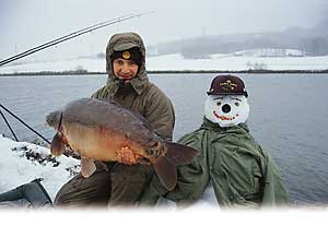 In der Winterzeit fische ich gern wenn Schnee liegt, weil mir dies ein ganz anderes Gefühl verleiht, wie das Fischen beim sommerlichen Grün. Seitdem ich in Deutschland lebe habe ich leider noch keinen richtigen Schnee gesehen, weil in meinem Wohnort der Schnee schneller schmilzt wie er fällt. Es war bisher immer so, wenn ich mit einer Futterkampagne anfing während Schnee lag, war er bis zum Tag des Angelns auch schon wieder weggeschmolzen. Vor ca. 2 Jahren konnte ich im Dezember eine Futterkampagne durchziehen und mit angeln beim Schnee beginnen. Ich hatte mit meinem Angelkollegen sehr viel Schwierigkeiten bei diesem Schneesturm unser Wohnzimmer aufzubauen. Als alles fertig war und die Köder auf dem Spot platziert, kamen mir kindliche Ideen auf die Marian nur mit Kopfschütteln reagiert hat. Ich wollte unbedingt einen Schneemann bauen und die dazu gehörende Schneeballschlacht machen und natürlich haben wir unser Angelgebiet mit unseren Namen im Schnee markiert (man weiß, wie das Kinder machen). Ich hatte irgendwie das Gefühl, daß die Fotos mit dem Karpfen im Arm neben dem Schneemann sehr witzig werden können und daß man nicht jedes Jahr diese Chance hat auf solche Bilder. Als alles fertig war gingen wir in unsere „Iglus“ und wärmten uns mit ein paar Gläsern Glühwein auf. Der Wind draußen klang wie eine Sinfonie für uns, bis ich wegen einem riesigen Döbel raus mußte. Ein paar Stunden später kam dieser lang gewünschte und erwartete Run. Ich denke, daß ich beim Rutenanhieb aufgeregter war als bei meinem ersten Karpfendrill und ich betete nur nicht den Fisch zu verlieren. Der Fisch, wahrscheinlich auch aus dem Winterschlag herausgerissen, kämpfte wie ein Verrückter. Mit wackeligen Knien hatte ich nach 15 – minütigem Kampf den Fisch über den Kescher gezogen. Beim Versuch ihn bis zu der Matte zu tragen, sah ich daß es sich um einen nicht schlechten Fisch handelt , was mir einen Freudenschrei entriss.